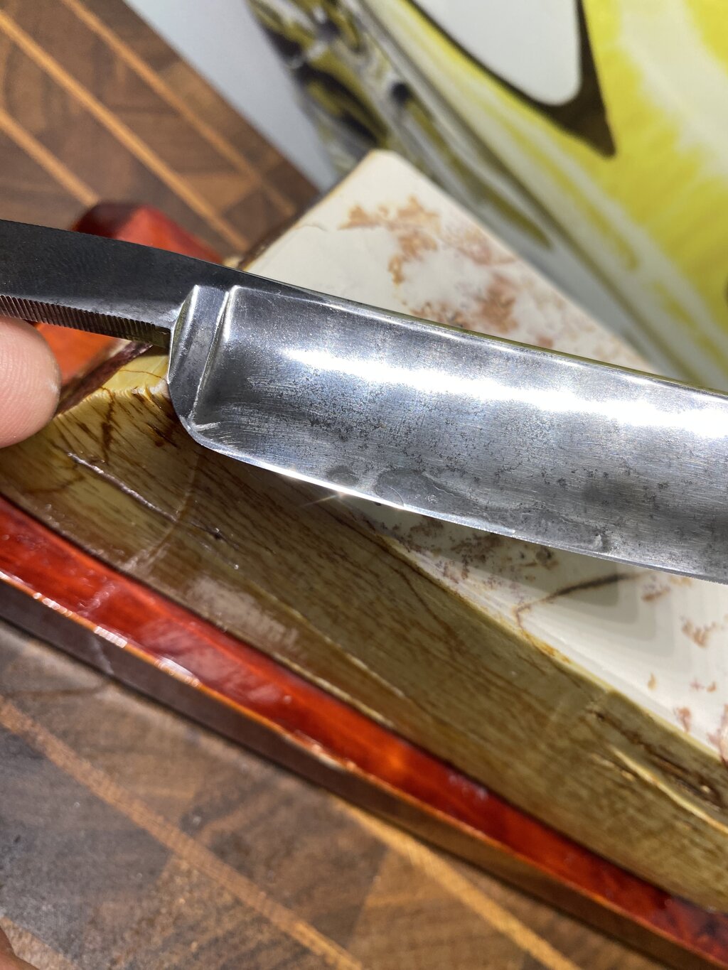 Rasiermesser 14er Goedecke Solingen gute 7/8 , Messer hat einen Riss im hinteren Drittel , der geklebt wurde. Hält seit Monaten und ist nicht spürbar.